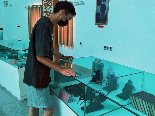 实践队员在观察《玛纳斯》陈列品 达尼亚尔摄