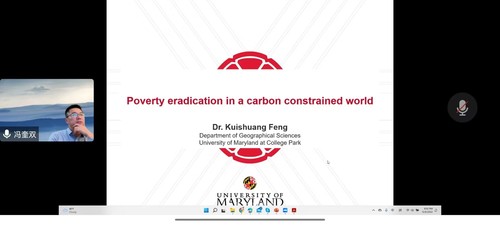 12月7日,6165cc金沙总站检测中心黄岛商科讲坛第75期顺利举办,论坛邀请到马里兰大学地理科学系的副教授冯奎双做题为“在一个碳约束的世界里消除贫困”的报告,会议依托“腾讯会议”的形式开展,学院部分老师及研究生参加本次论坛。