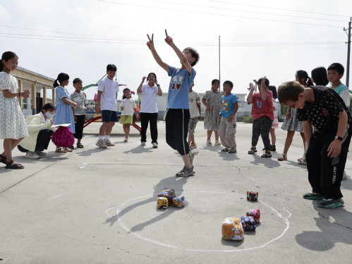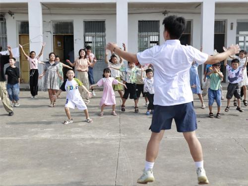 支教队员带领热身 张雅慧摄