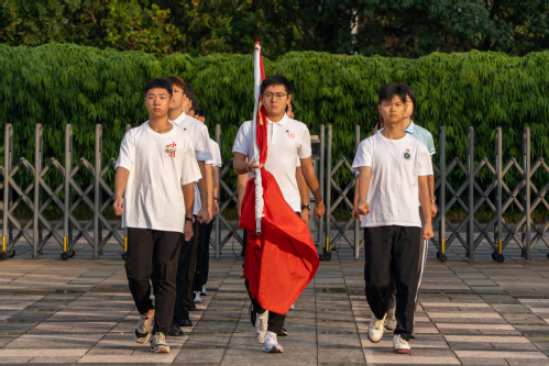 迎着清晨的第一缕阳光,庄严的升旗仪式在基地广场举行,先声讲解团-红源实践队员李自正担任主旗手。
