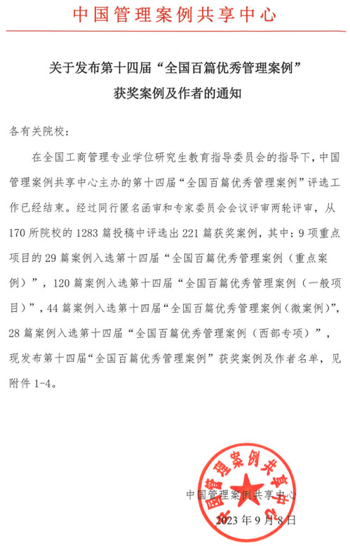“全国百篇优秀管理案例”由全国工商管理专业学位研究生教育指导委员会组织评选,已纳入学科评估指标体系,迄今已成功举办十四届。本次评选共收到全国170所院校1284篇投稿,最终120篇案例入选“全国百优”一般案例项目。