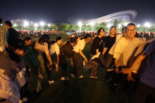 活动伊始,灯火微明下,我院各班级队列整齐来到体育场。安排好场地后,各班带领人向学生进行自我介绍,并指明此次活动的意义——迅速拉近师生、同学们的关系,更快地适应大学生活。随后,各班开始进行“兔子舞”、“信任坐”、“手有千千结”等游戏,体育场人声鼎沸。游戏进行中,同学们积极参与,伴随欢声笑语,借助表演节目等“惩罚”,同学们积极地展现自我。活动结束,各班于背景板下合照留念,将美好定格。