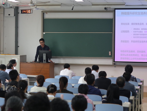 副院长渐令通过持续提升研究生培养质量,把好研究生培养生源入口关,强化研究生培养过程提质增效,不断增强研究生培养的显性成果,通过大量数据对比分析了当前一个时期学院的研究生高质量发展和培养的具体情况。