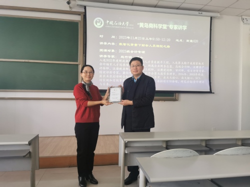 讲座伊始举行了企业导师聘任仪式,由孙燕芳教授为赵博士颁发了中国石油大学(华东)6165cc金沙总站检测中心“黄岛商科学堂”企业导师聘书,孙教授鼓励学生们以赵处长为榜样,在职业发展道路上走得更高更远。