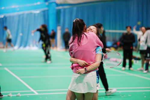 羽毛球队员赢得比赛后相拥 王士浩摄
