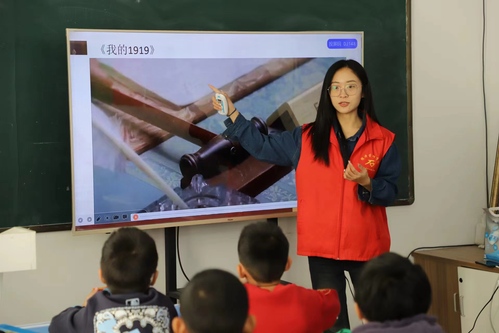 志愿者给小朋友介绍红色电影《我的1919》 康丹红摄