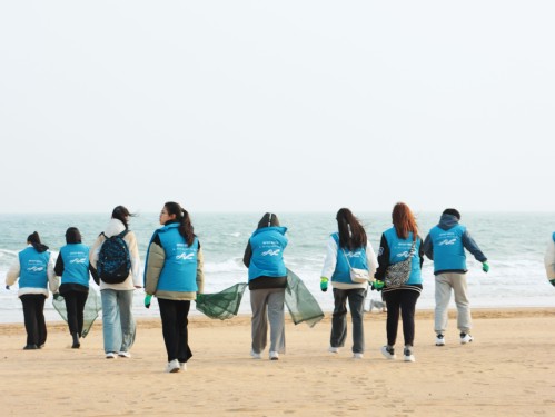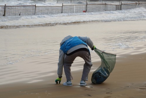 寒风凛冽,难凉热血。下午十四时,净滩队伍如约来至金沙滩集合,身着与海洋同色系的蓝色马甲,手戴胶皮手套,持垃圾网袋分组行动。净滩成员相互协助,仔细搜寻,小到瓜子皮、掉落的烟头,大到塑料袋,废旧泡沫壳子,全部“收入囊中”。一次次弯腰,一次次捡起的举动感化了前来观海的路人,他们清楚缘由后,感慨:“现在的青年真是了不起!感谢你们付出的行动!”也不禁化身净滩队伍一员,帮助清理海滩垃圾。一小时之余,垃圾网袋便满载“战利品”,途经的一余公里海岸线焕然一新。