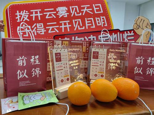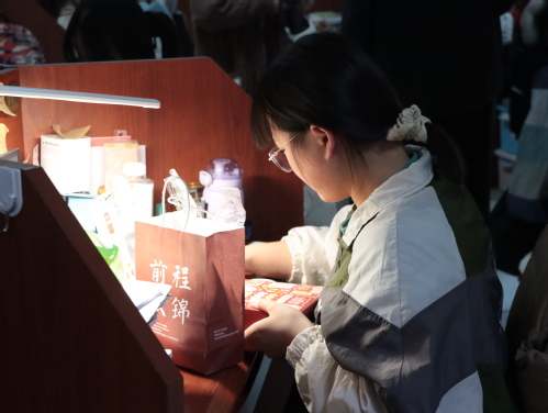 袋袋礼包,一举成“硕”。活动伊始,老师们为考研学子送上了精心准备的“考研加油福袋”。亲手书写祝福语的台历、寓意心想事“橙”的橙子、根据学生喜好定制的“考研加油”摆件、抵御严寒的暖宝宝和缓解眼部疲劳的蒸汽眼罩,无不饱含着浓浓关爱和殷殷祝福。学院还安排志愿者深入考研学生宿舍为未能到现场参加活动的考研学子送上“考研加油福袋”,确保每一位考研学子都能感受到来自学院的关心与祝福。