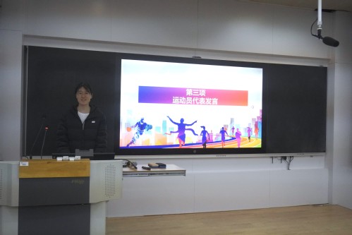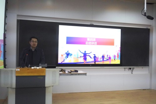 会议伊始,唐丽坤对健身节成绩进行宣读。她首先介绍学院的整体名次及个人奖项获奖情况,就各运动项目介绍参赛队员与所获名次,并向取得优异成绩的学生表示祝贺、向负责学院体育工作的师生表示感谢。宣读完毕,获奖团体代表与个人分三批上台领奖并与颁奖的领导、老师合影留念。随后,学生代表管理科学与工程专业研究生2022-1班柴同平上台发言,她深刻剖析自己取得优异成绩的原因,对学院,团队等表达诚挚的感谢,并饱含深情地分享了体育精神对她的意义。最后,孟兆刚做总结发言,他对学生在健身节中的表现予以高度肯定,并对今后学院体育事业发展寄予厚望。