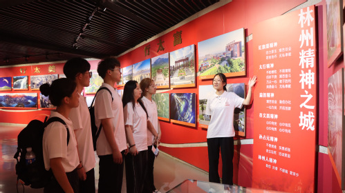 红旗渠纪念馆馆体犹如舞动的红旗、流动的水,是红旗渠形象的抽象表达。队员们走进“千年旱魔,世代抗争”、“红旗引领,创造奇迹”等五个主题展区,近距离接触红旗渠的物质载体与其蕴含的精神内涵。老式马灯、除险钩、炸药箱……一幅幅珍贵的历史照片、文献资料,一件件穿越时空的“老物件”,真实的山体塑形,雄伟的人物浮雕,立体展现了“十万大军战太行”的震撼场景,队员们仿佛回到了那个艰苦创业的岁月。当年,为彻底解决干旱缺水的现状和等天靠雨的恶劣生存环境,林县人民在党和政府的支持下,在万仞壁立、千峰如削的太行山上,苦战10个春秋,削平山头1250座,开凿隧洞211个,最终修建了全长1500公里的“人工天河”——红旗渠,孕育形成了“自力更生、艰苦创业、团结协作、无私奉献”的红旗渠精神,见证了红旗渠儿女“战太行、出太行、富太行、美太行”的光辉历程。