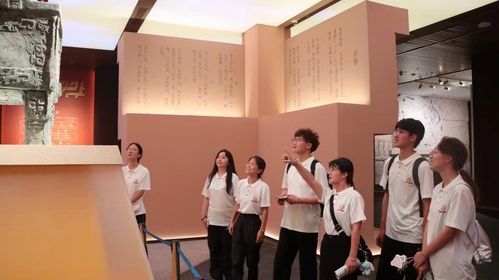 从殷墟文明中领悟文化自信。队员们沿着习近平总书记的足迹,走进中国文字博物馆、殷墟博物馆与殷墟宫殿宗庙遗址共同体会古老殷墟文明的独特魅力,感受中华文明的伟大力量。从嵌绿松石甲骨刻辞骨柶到各类甲骨文骨片,从司母辛鼎到亚长墓出土的青铜钺,实践队队员仿佛穿越时空“与文物对话”,切身感受古老神秘的商代文明,深刻致敬中华文明的深厚底蕴。