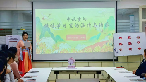 随后,国学品牌实践队育菁小萌仙成员于祥漪带来“国学小课堂”分享,她从中秋祭月、月饼象征讲起,娓娓道来重阳登高、插茱萸的习俗演变,生动诠释了传统节日中蕴含的家庭观念与敬老精神,让支部成员们对传统文化节日的认知从表层习俗深入到精神内核。